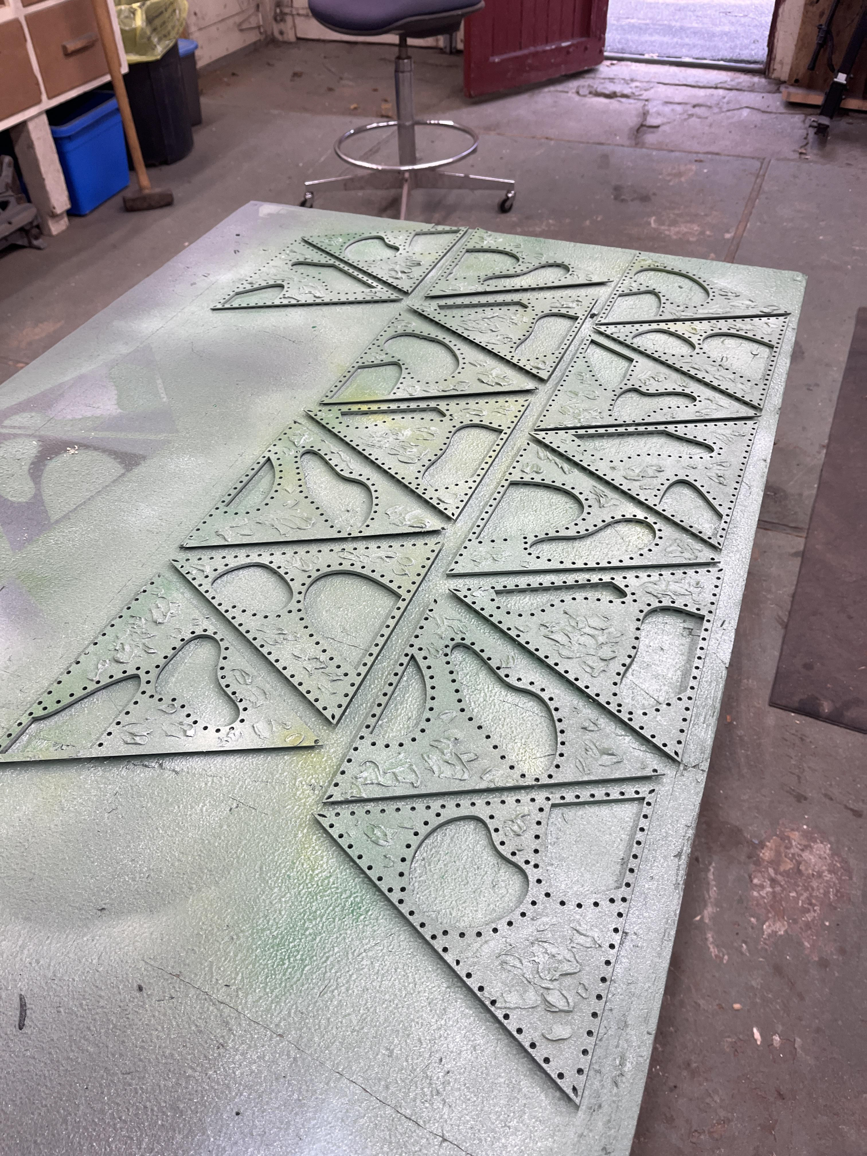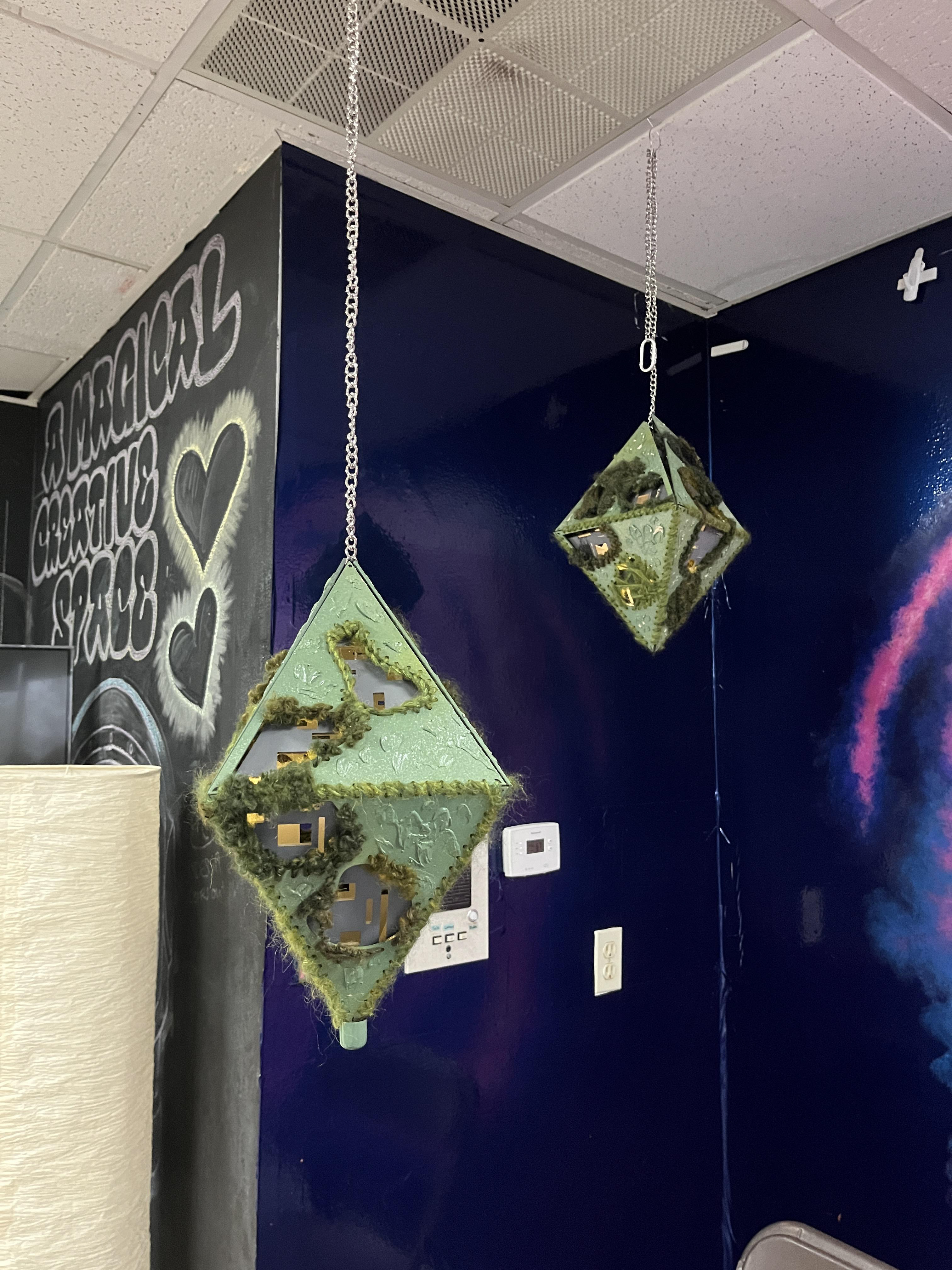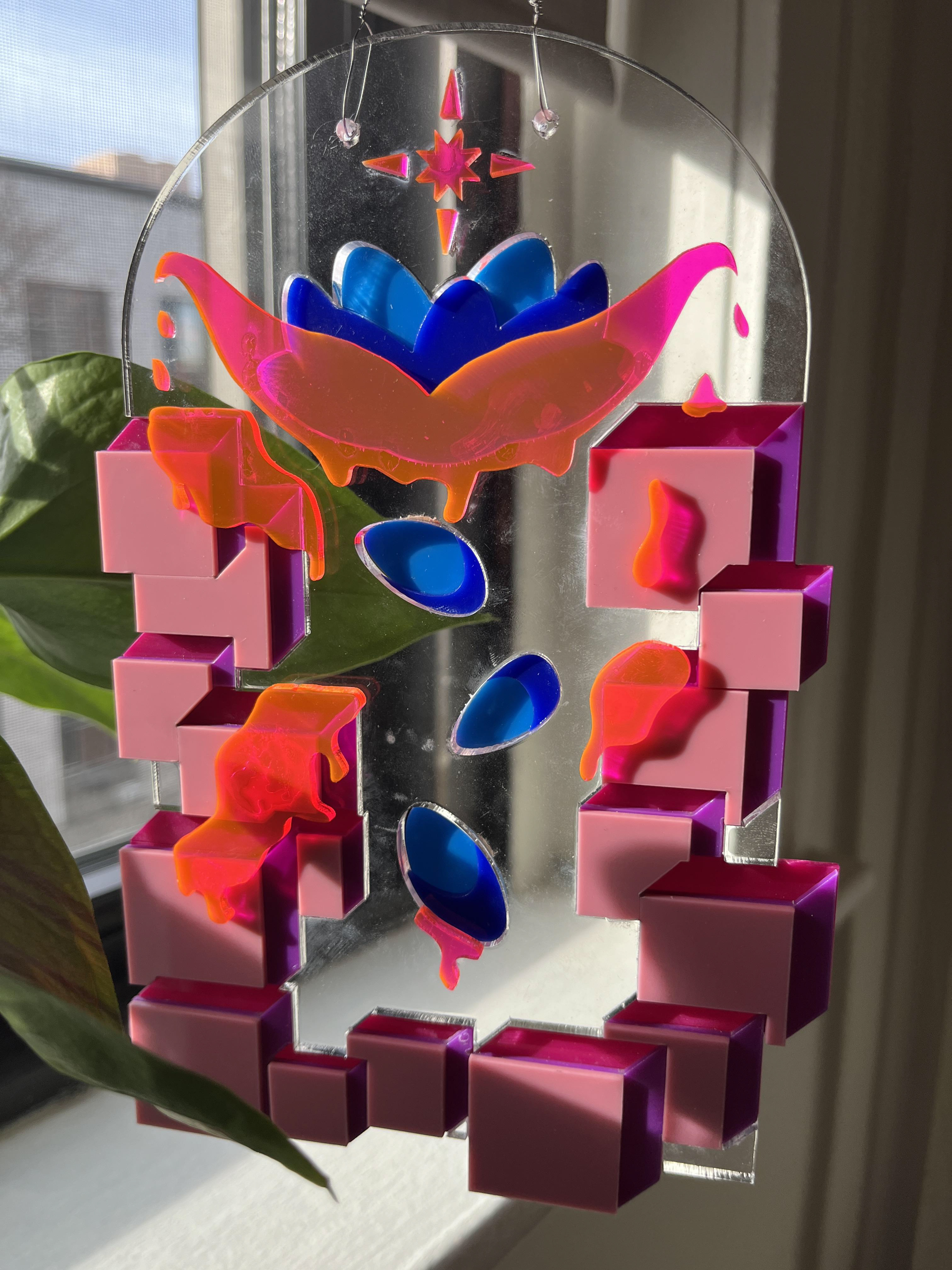 Spackle, paint and yarn on laser cut MDF. LED light strips on inside. Featured in SPARK exhibition.