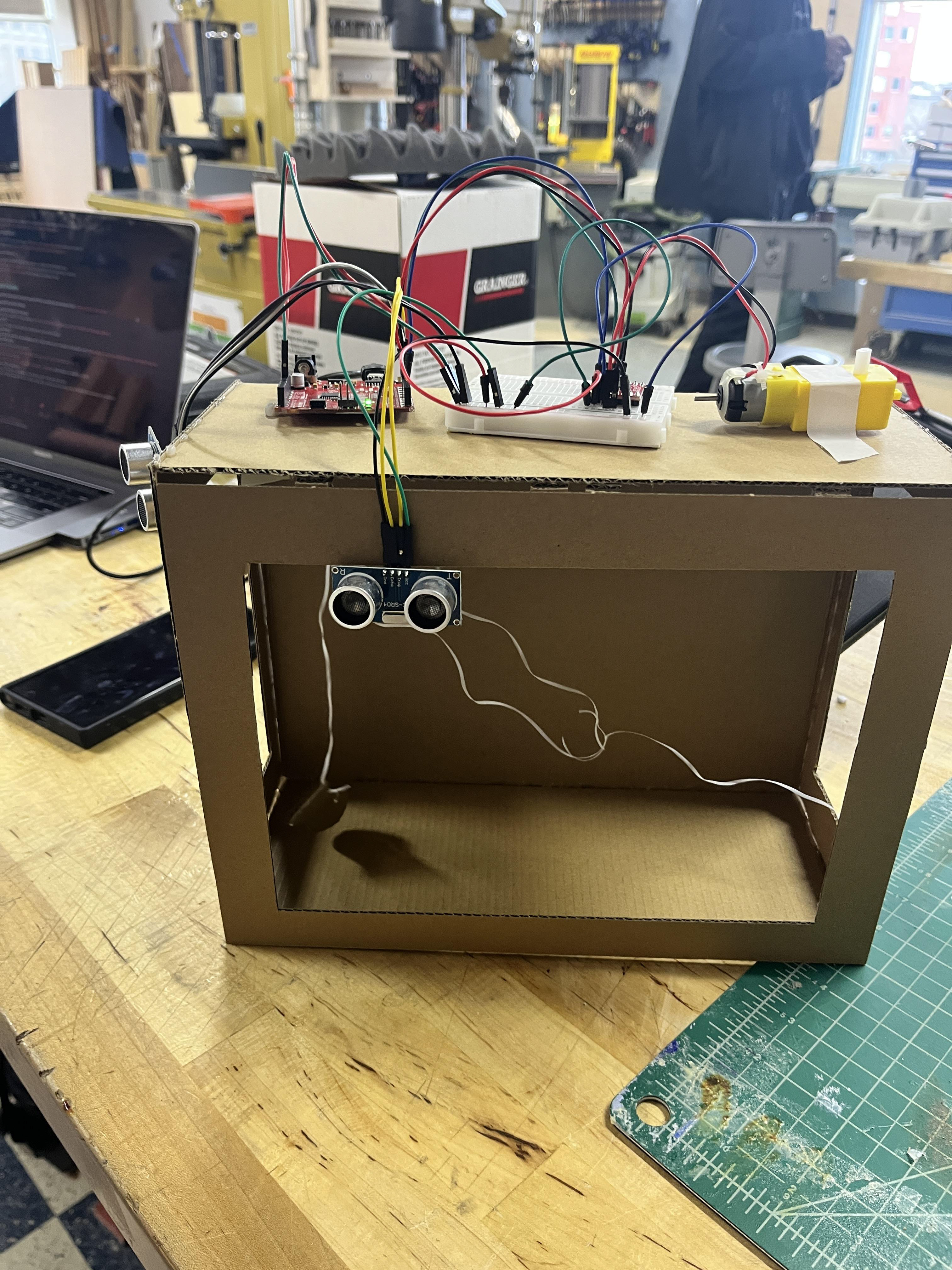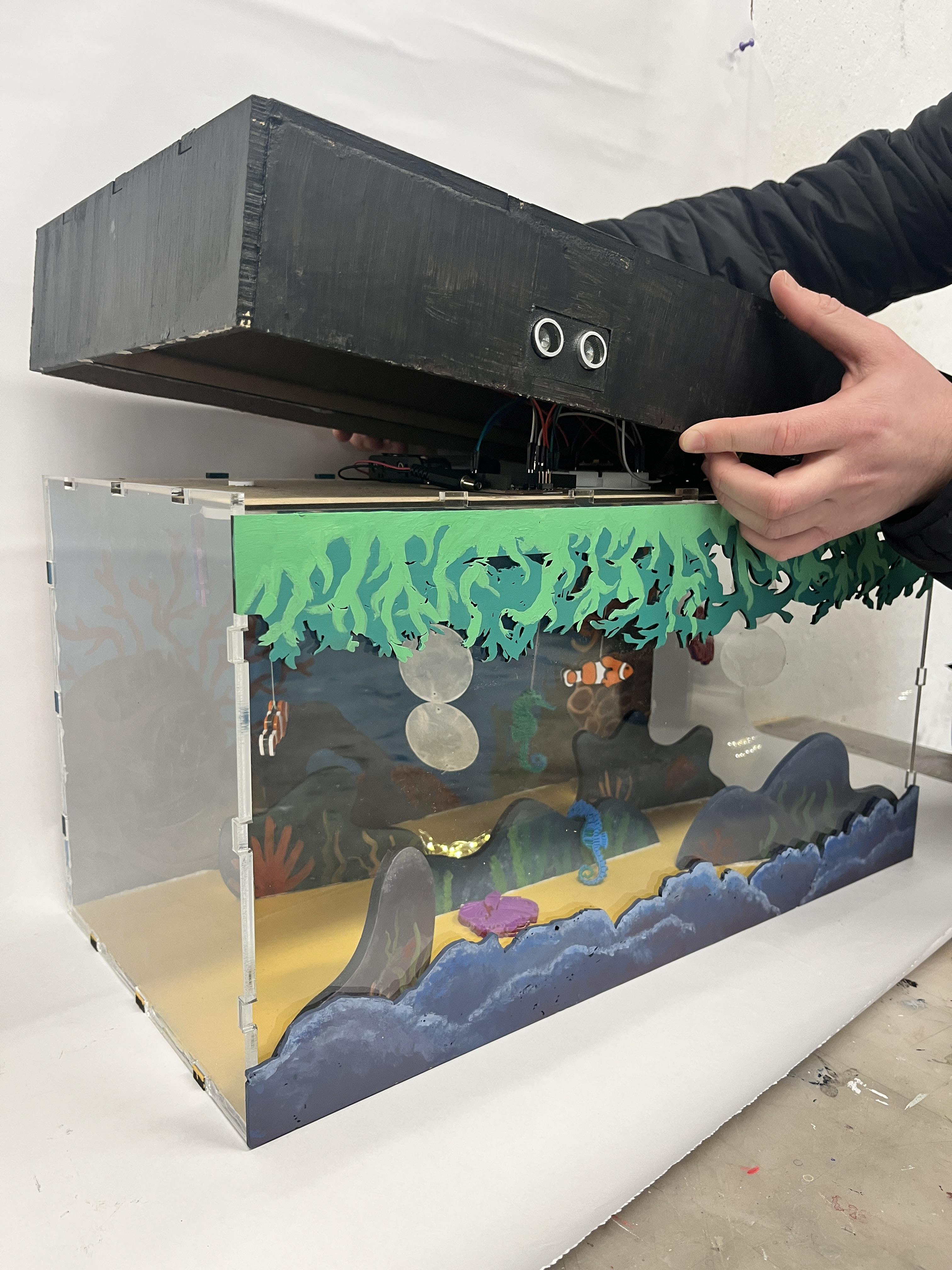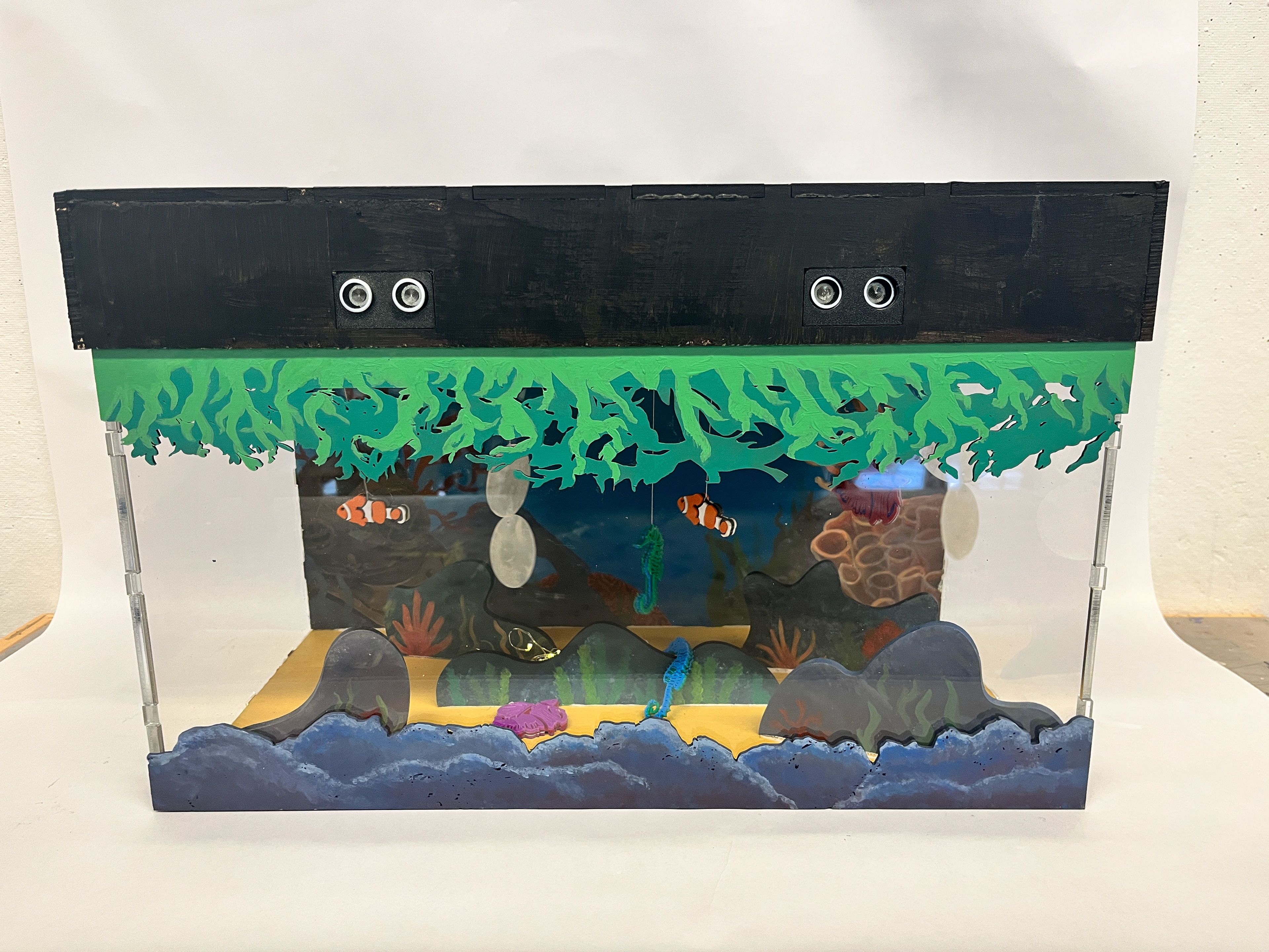 Acrylic and MDF tank with fish and wind chimes that move in the direction of the observer.