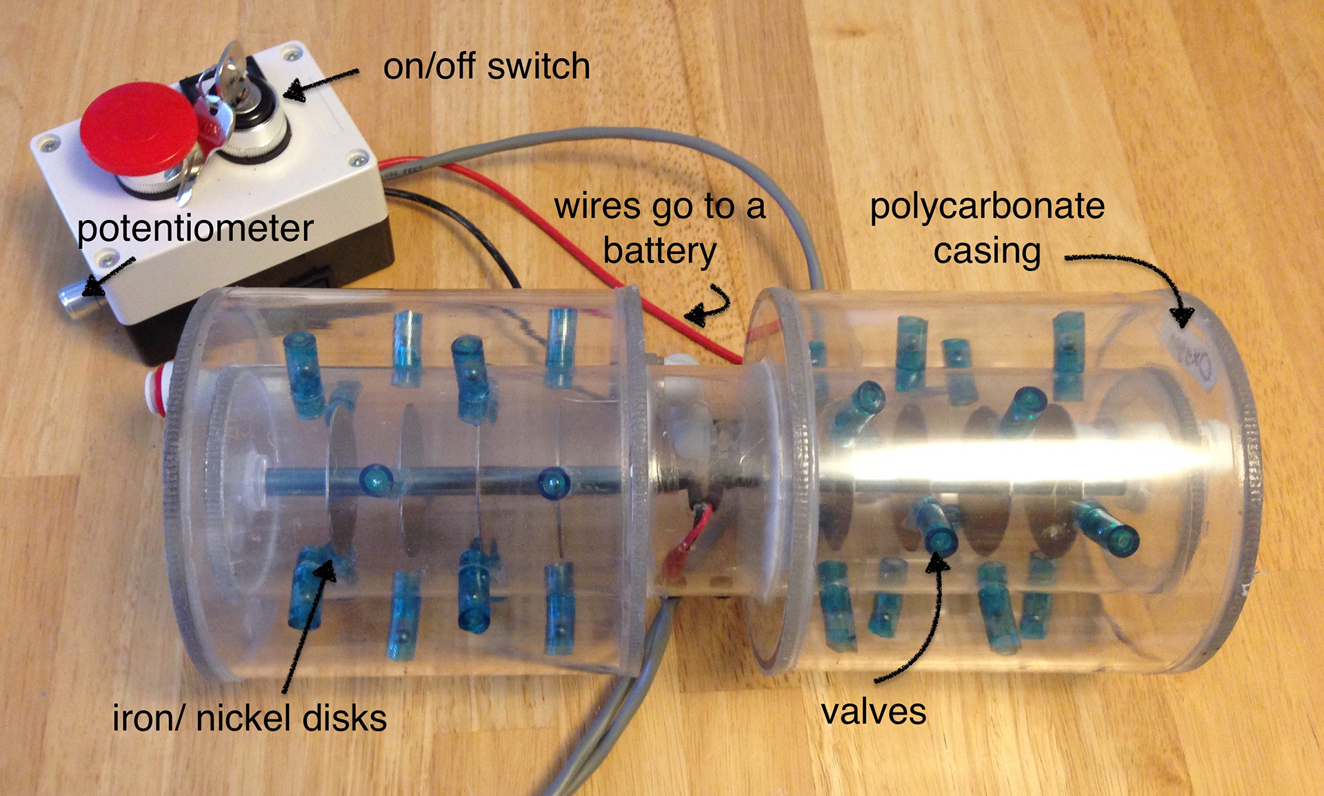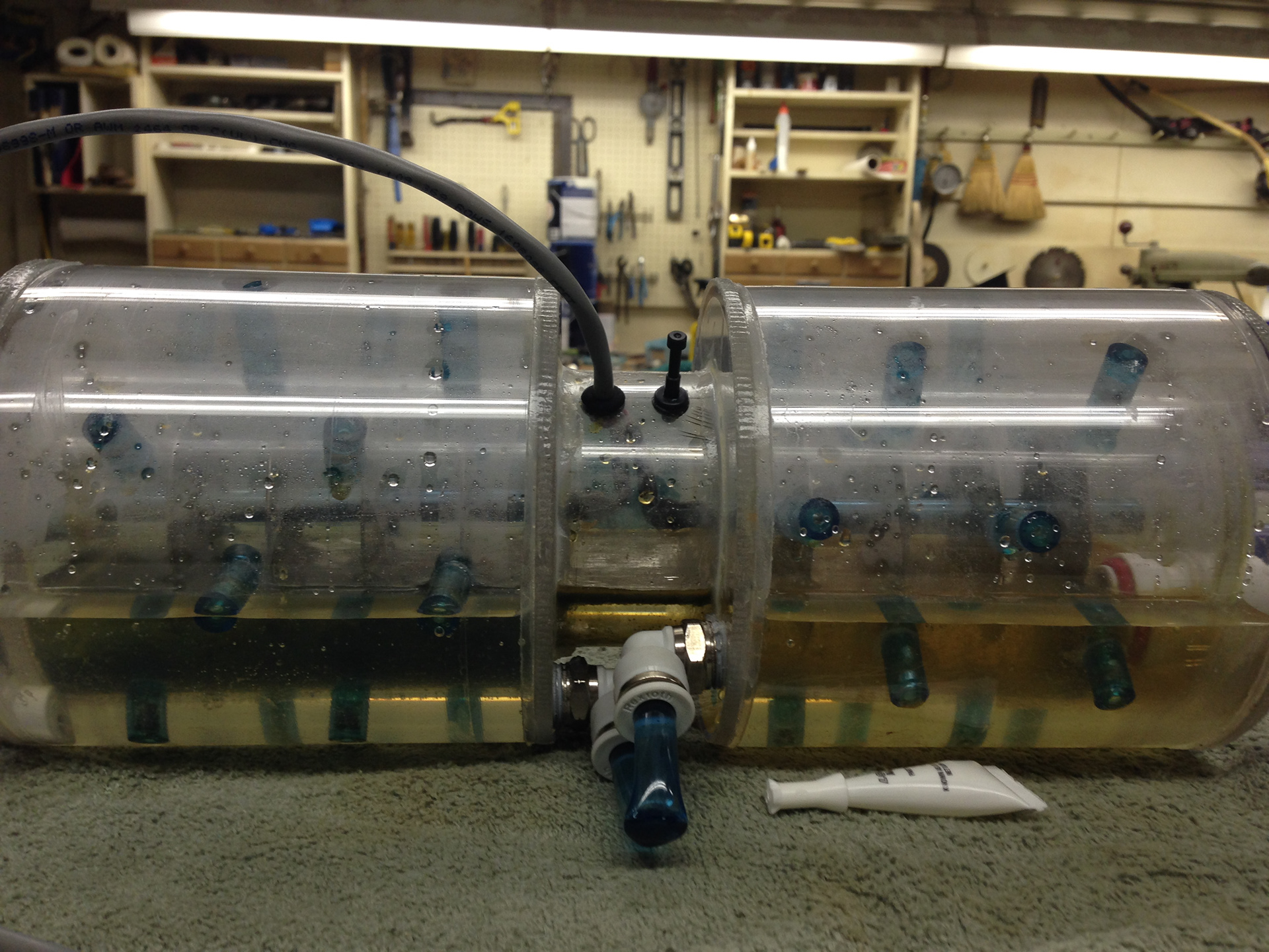 Underwater breathing device that uses electrolysis to convert water to breathable oxygen and discarded hydrogen.